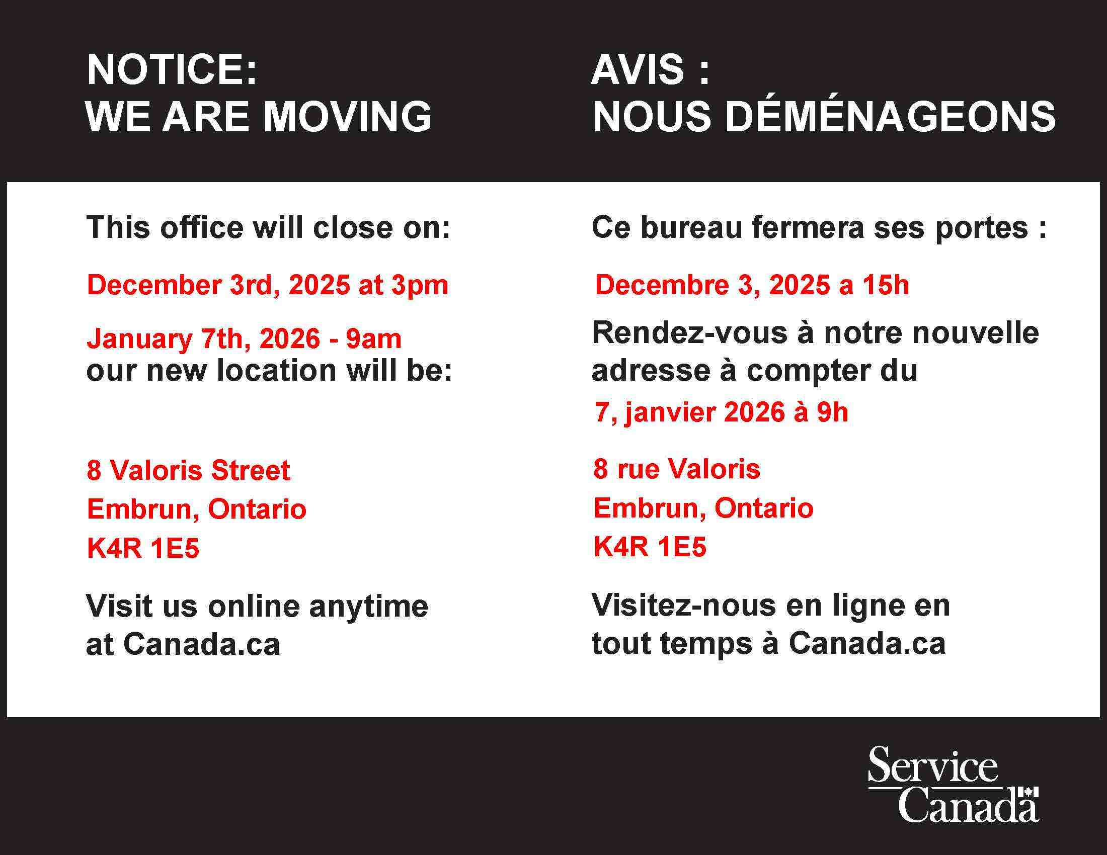 Although the Municipality has tried to keep the service in Casselman, the mobile Service Canada unit for processing passport applications, usually available at 750 Principale Street on the 1st and 3rd Wednesday of each month, will now be relocated to Embrun. The official notice from Service Canada is attached to this post.
