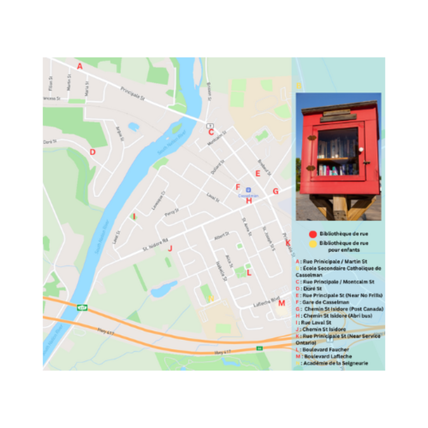 These free street libraries offer books in both French and English for children and adults, accessible at any time of the day or night. Anyone can borrow, exchange, or deposit books, thus promoting the sharing and dissemination of culture within the community. These initiatives aim to encourage reading and strengthen the bonds between the residents of Casselman. By creating meeting points around books, they also provide a space for discovery and dialogue for all ages, contributing to a richer and more dynamic community life.